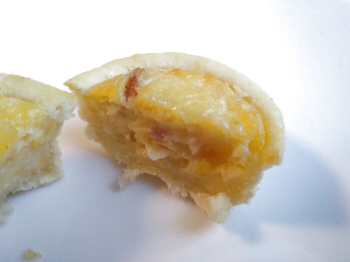 コストコのミニキッシュは、「スモーキーベーコン・テイスティチーズ味」と「リコッタ・ほうれん草・サンドライトマト味」の2種類入っていて、この黄色いほうが「スモーキーベーコン・テイスティチーズ味」で、茶色いほうが「リコッタ・ほうれん草・サンドライトマト味」です。