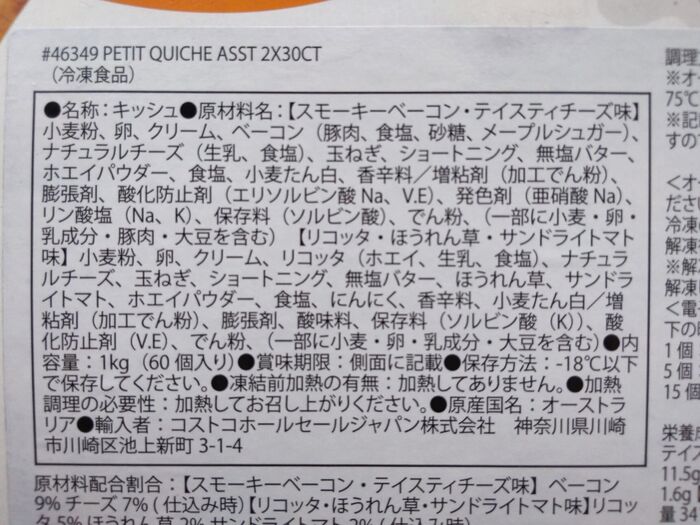 コストコのミニキッシュアソートの原材料は、こちらの通りです。