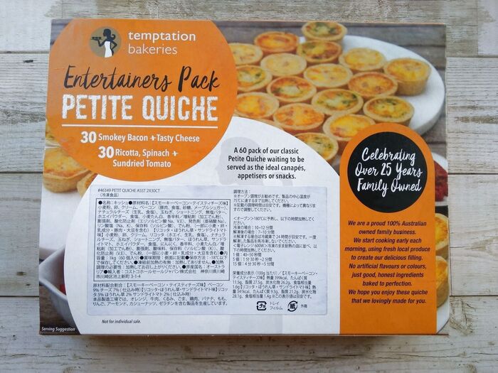 コストコのミニキッシュは、2種類のミニキッシュが、それぞれ30個ずつ入っていて、合計60個になります。