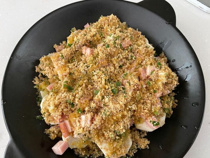 里芋に小さな角切りにしたベーコンと③のパン粉をのせ