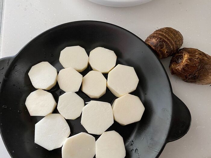 里芋は皮をむき1.5㎝厚さの輪切りにして耐熱皿にのせ