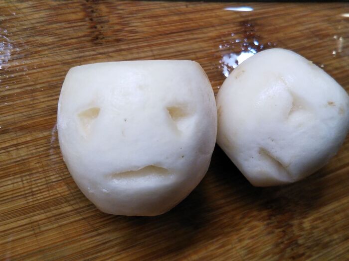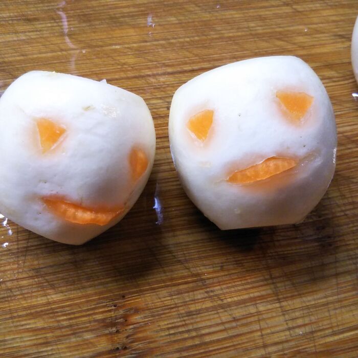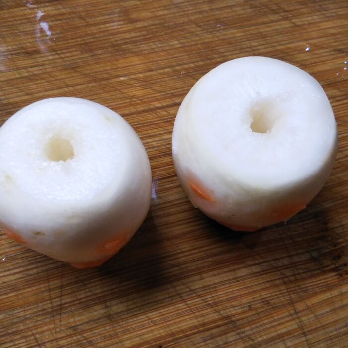 ②カブに爪楊枝で穴(目と口)を開け、人参を詰める。