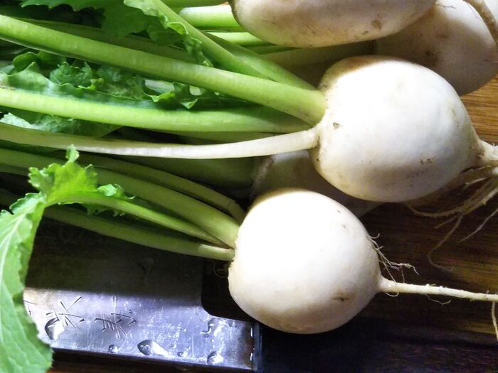 ①カブを綺麗に洗い、茎葉を切り、実は(皮を剥かずに)上下を少し切り平らにする。