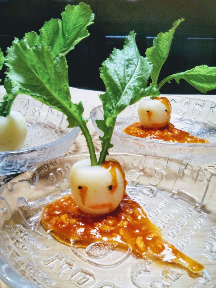 ③トマトソースをカブの頭・目・口部分に垂らして出来上がり!