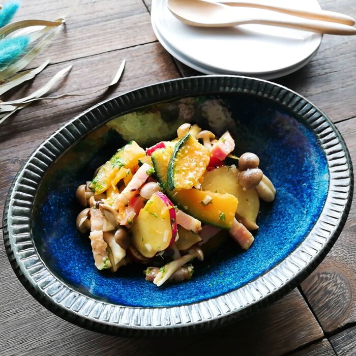 秋の旬野菜をふんだんに使ったべじソテーは、ガーリックの香りが引き立ち食欲をそそる一品。さつまいもやかぼちゃには、肌を丈夫に保つビタミンCや、抗酸化力の高いビタミンE、免疫力を高めるベータカロチンも豊富に含まれ女性にとってうれしい栄養ばかり。根菜類は体を温める効果もあるため、寒暖差が大きく体調を崩しやすい季節におすすめのレシピです。