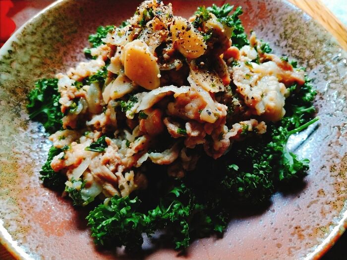 4.にんにくとパセリを入れ水分を飛ばしながら更に炒める