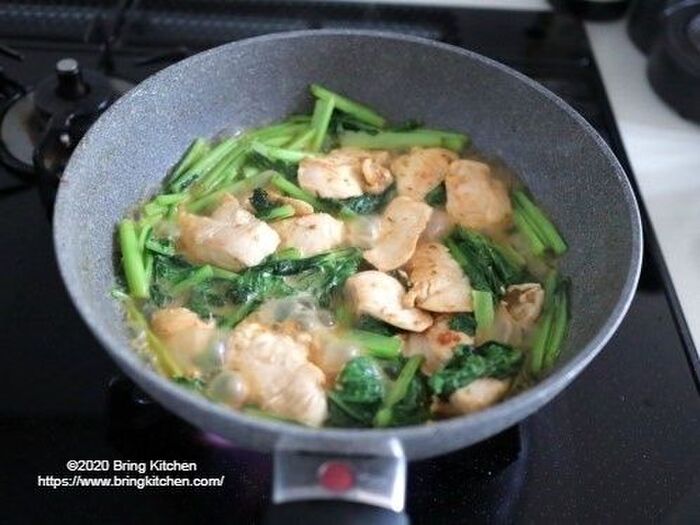 小松菜がしんなりとしてきたら葉の部分を加え、塩、酒、めんつゆ、マヨネーズを加えて、マヨネーズを溶くようにして炒める。