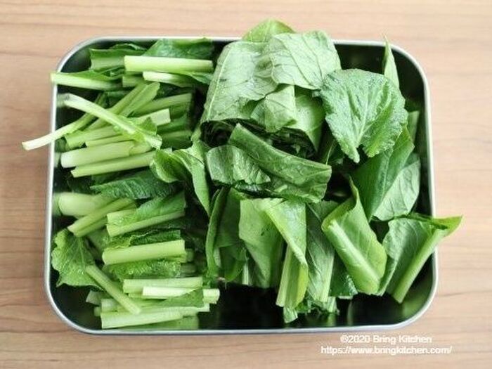小松菜は3㎝程度のざく切りにし、茎の部分と葉に分けておく。