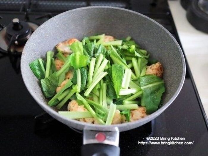 オレガノが全体に絡んだら、小松菜の茎の部分を入れる。