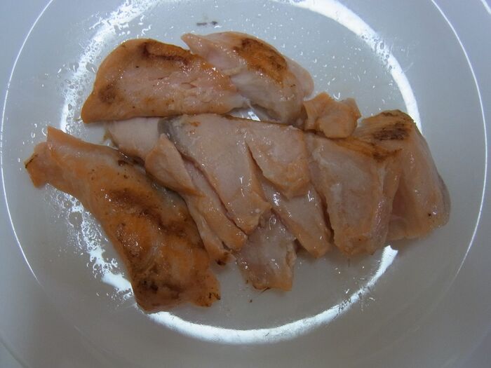 塩が馴染んで水分が出ているので、ペーパータオルで取り、オリーブオイル大さじ1/2を敷いたフライパンで焼きます。