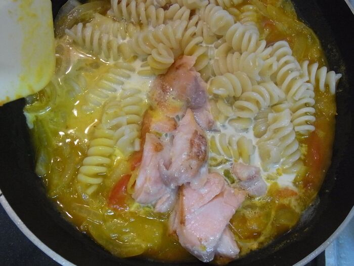 茹で上がったパスタ、サーモン、生クリームを加え混ぜ合わせます。