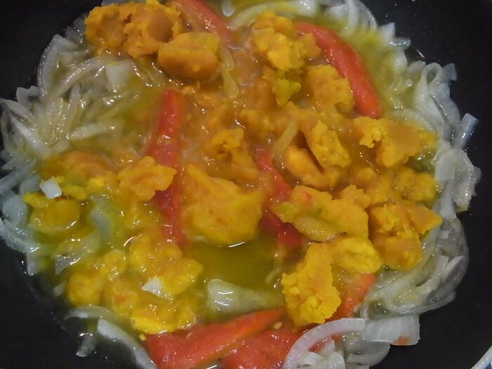 カボチャに竹串を刺してスーッと入ったら熱いうちに粗く潰します。100gだけ使います。