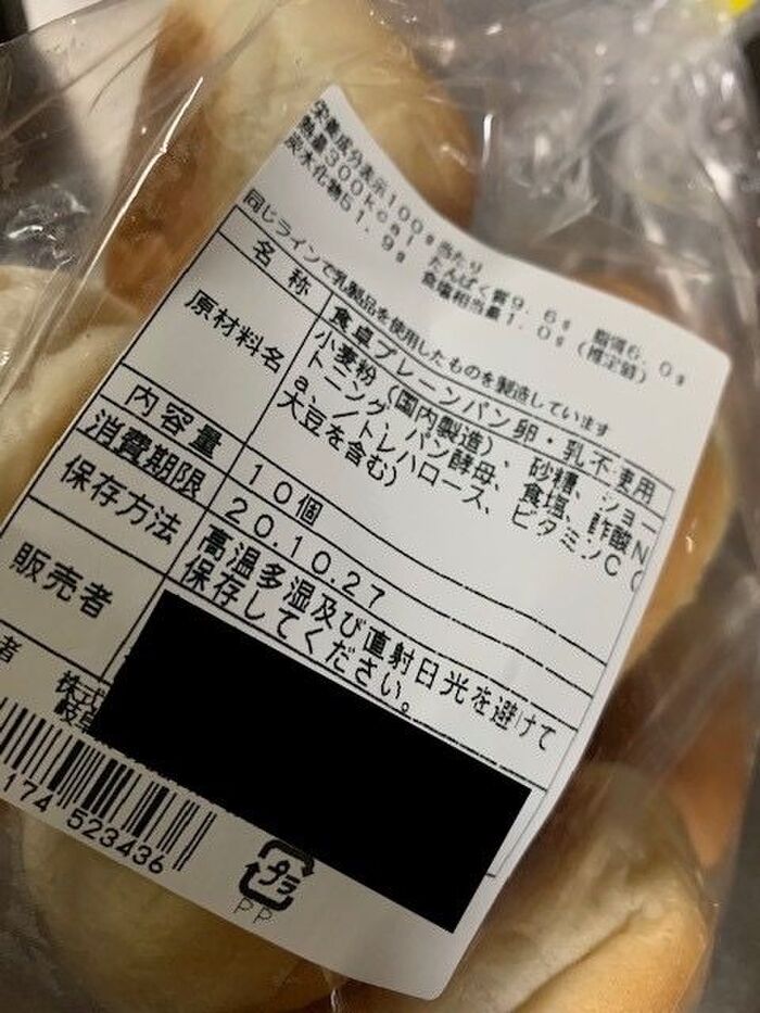 こちらは同じ店で売られていた別のテーブルロール。同じくらいの値段でも、ウラ側をみると少し違っていますね。食品添加物は2つ。天然由来の甘味とビタミンCのみ。原材料もちょっとシンプル。