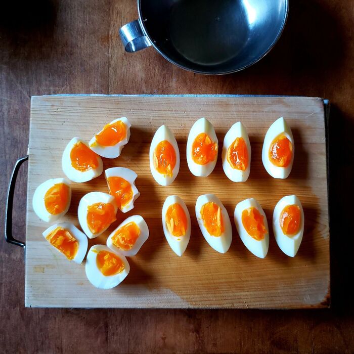 卵の切り方に特にこだわりはないですが、左側の切り方の方が白身と黄身が離れにくいような気がしています。