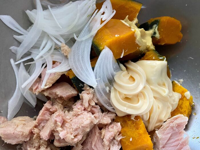 ボウルに水気を切ったかぼちゃ スライスした白玉ねぎ
