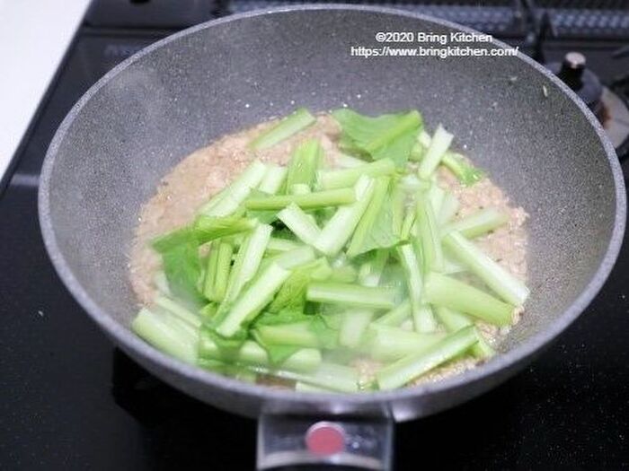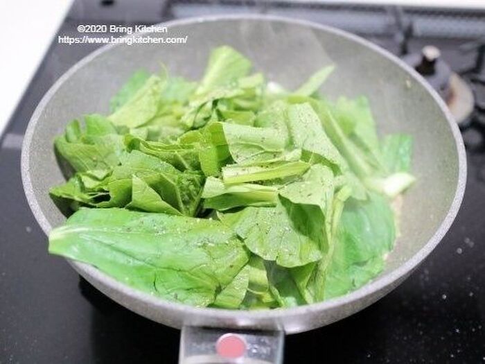 小松菜の茎に油が回ったら、葉と塩、黒胡椒を加えて炒める。