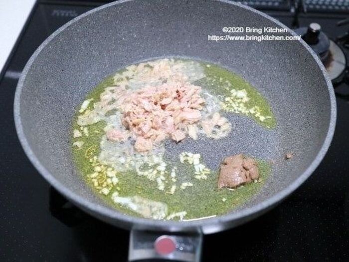 にんにくから香りがしたら、アンチョビペーストとツナ缶をオイルごと加える。