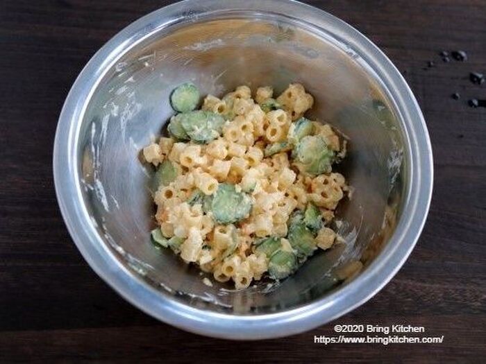 水気を絞ったきゅうりと、湯を切ったピエトロ AGNESI(アネージ)ディターリリーシをボウルに加えて、よく混ぜたら完成。