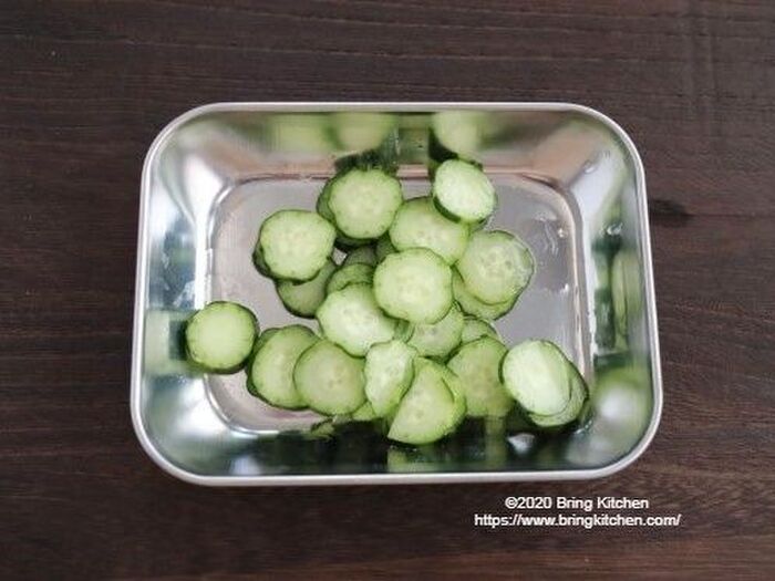 きゅうりは所々皮を剥いて、薄切りにしたら塩を少々振っておく。