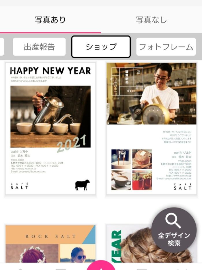我が家は、ショップをしているわけではありませんが、OKU CAFE(友達と月1~2回ワイワイしているウチカフェ)をイメージしたシンプルで可愛すぎない年賀状を作りたかったので、ショップのカテゴリーの中から選んでみました。