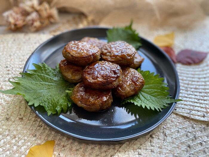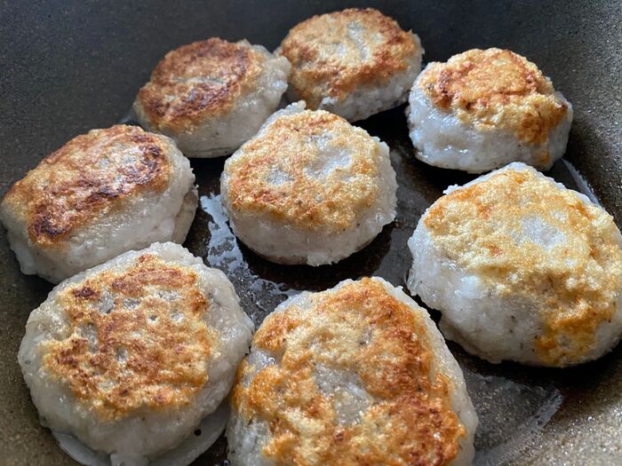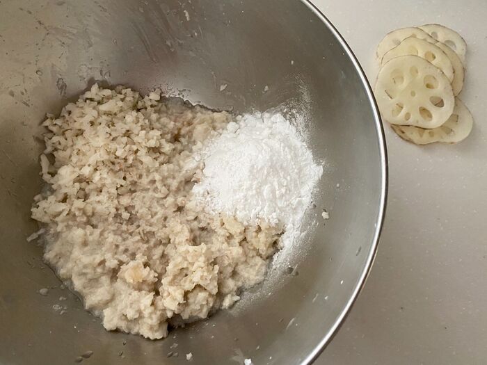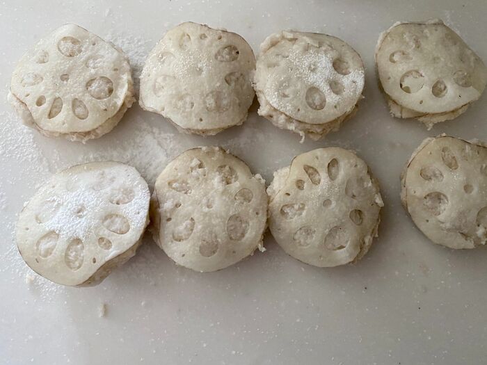 生地を8等分して つくね型(丸く平たく)にしてスライスレンコンを