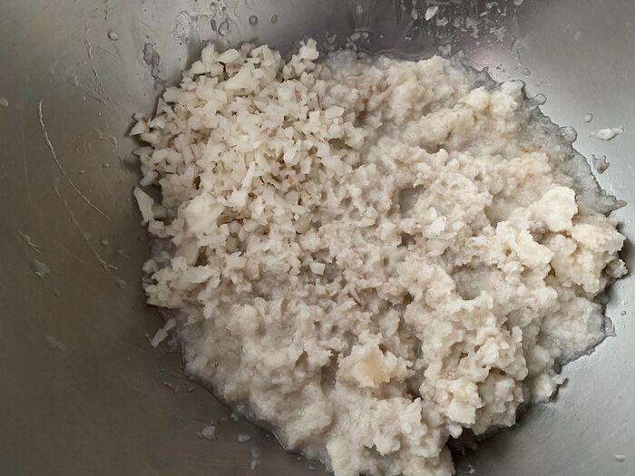すりおろしたレンコンは いったんザルにとり軽く水気を切って
