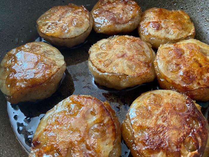 フライパンにごま油を入れ レンコン の両面をカリッとするまで焼く