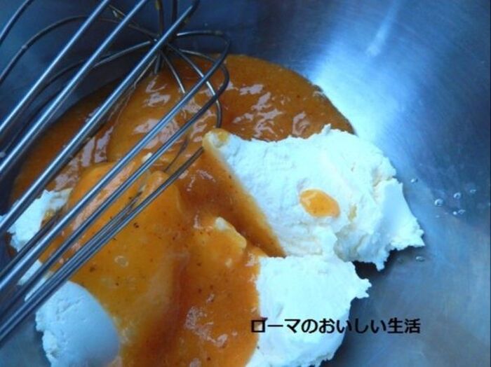 スカルポーネに砂糖を混ぜ 柿のピュレ3/4を加え よく混ぜ