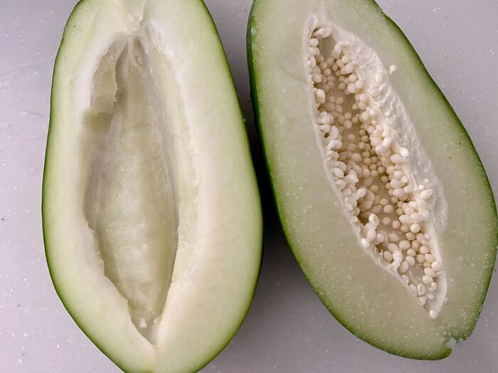 青パパイアは半分に切り中の種をとり皮をむき スライサーなどで