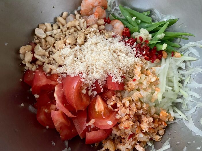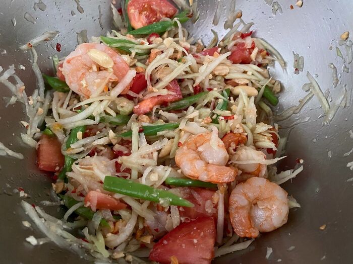 青パパイアの水気をしっかりときり 茹でエビ さっと茹でて斜め切りした
