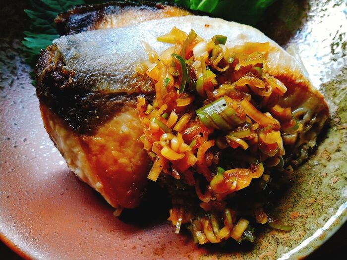 5.皿にサラダとぶりを盛りつけ2のネギソースをたっぷりかけて完成