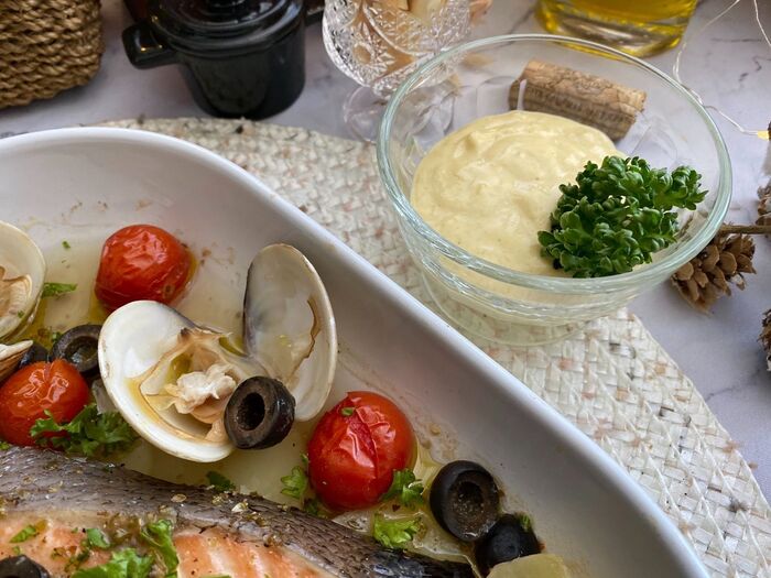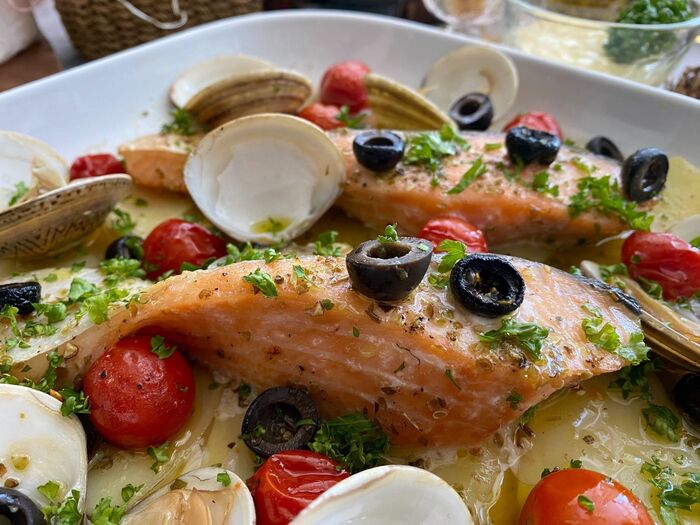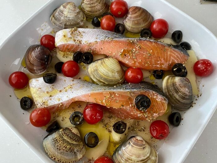 丸ごとプチトマト 半分に切った黒オリーブ ハマグリをのせ