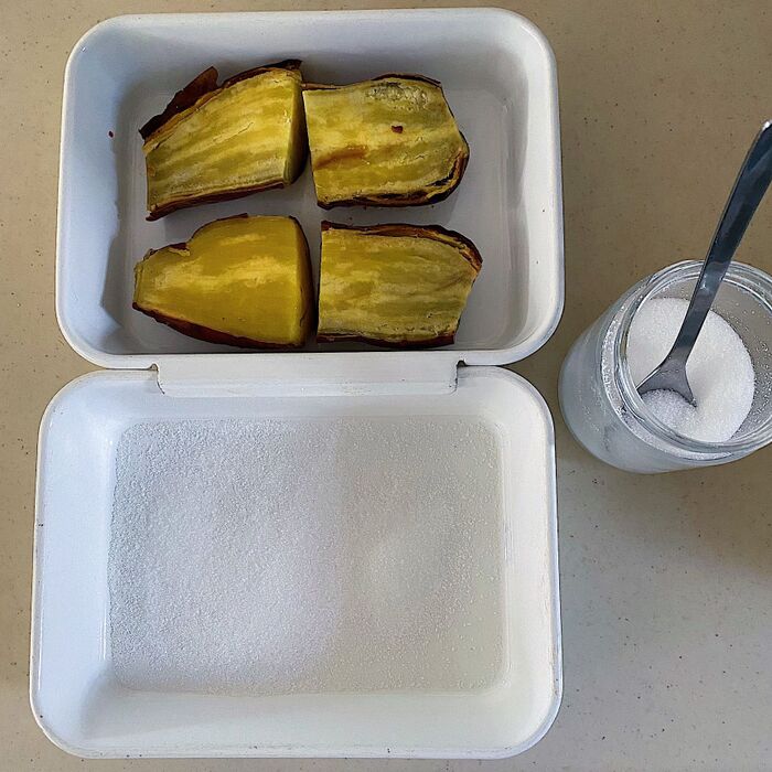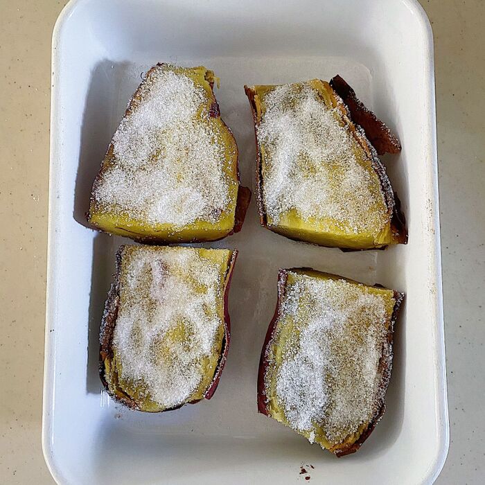 グラニュー糖をバットにいれて、焼き芋のカットした面を下にしてグラニュー糖をつけます。