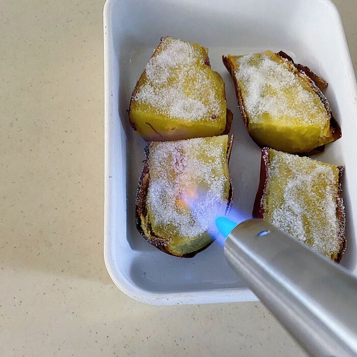 焼き芋の真ん中を狙って、そこから広げて焼き色をつけてグラニュー糖を溶かしていきます。