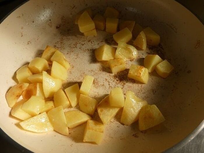 フライパンに油とじゃが芋を入れて焼きます。表面がカリッとしたら取り出します。