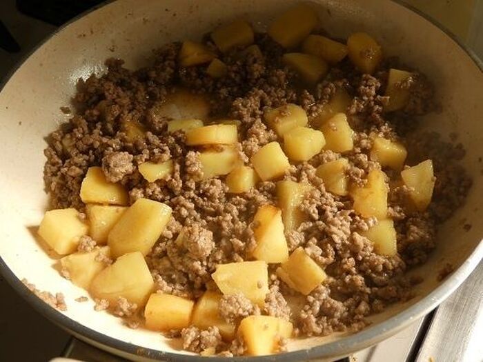同じフライパンでひき肉を炒めます。ひき肉の色が変わってきたら余分な油を拭き取り、じゃが芋と★印の調味料を入れます。