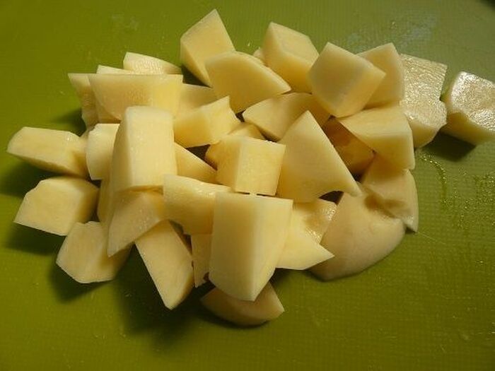 じゃが芋は皮をむいて2㎝角に切ります。耐熱容器に入れ、電子レンジ600wで2分加熱します。