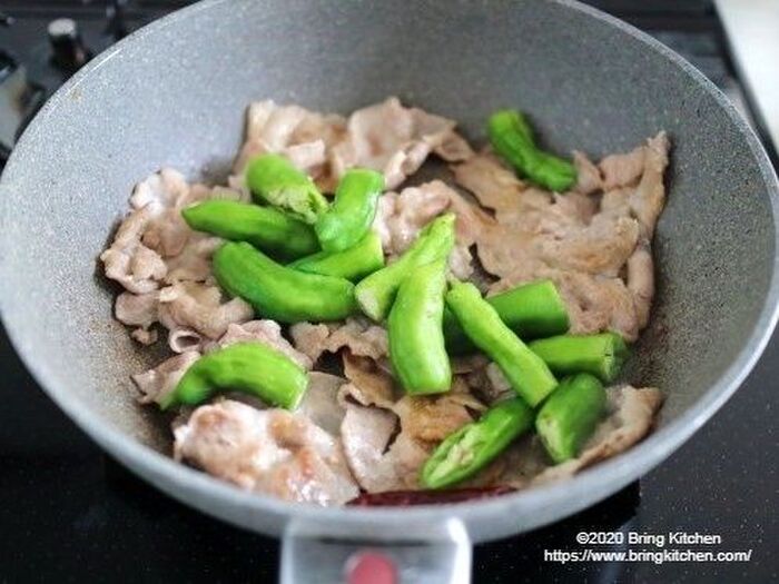 焦げ目がついたらひっくり返しししとうを加える。