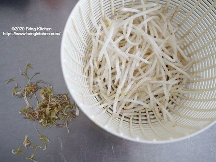 もやしは根と髭を取ると、口当たりと仕上がりが良くなります。(面倒なら省略しても大丈夫です)