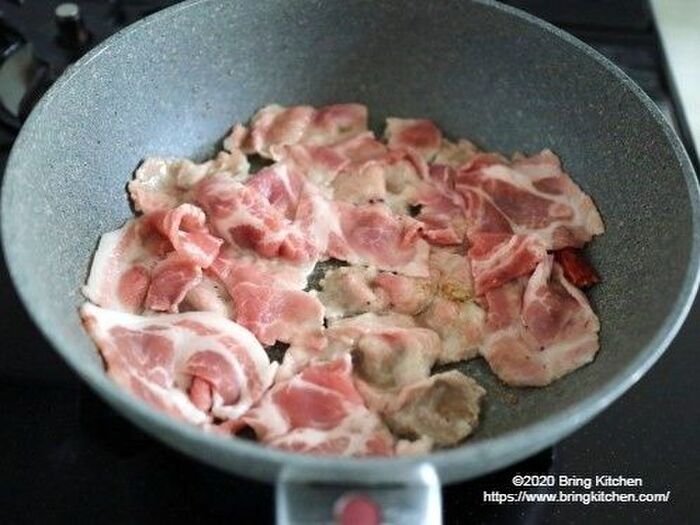 にんにくから香りがしてきたら豚こま肉を広げながら重ならないように入れて焼く。