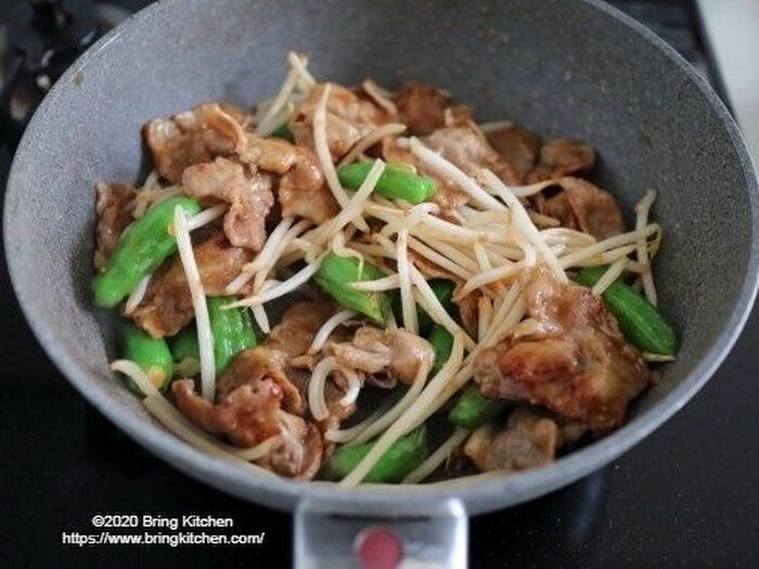 ししとうに油が回ったら、合わせ調味料ともやしを加える。