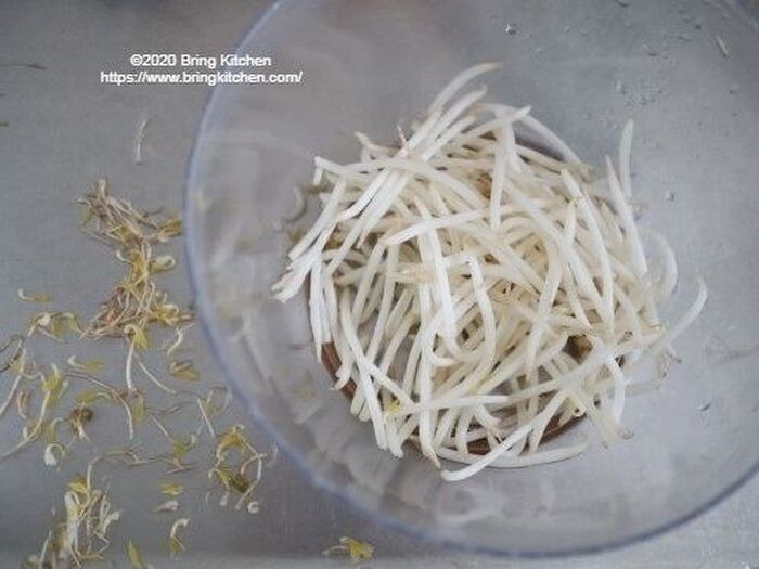 もやしは根と髭を取ると、口当たりと仕上がりが良くなります。(面倒なら省略しても大丈夫です)