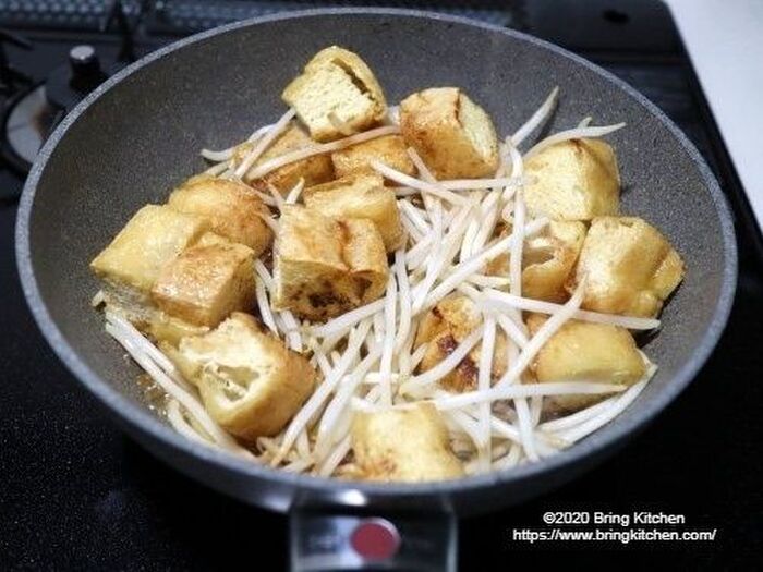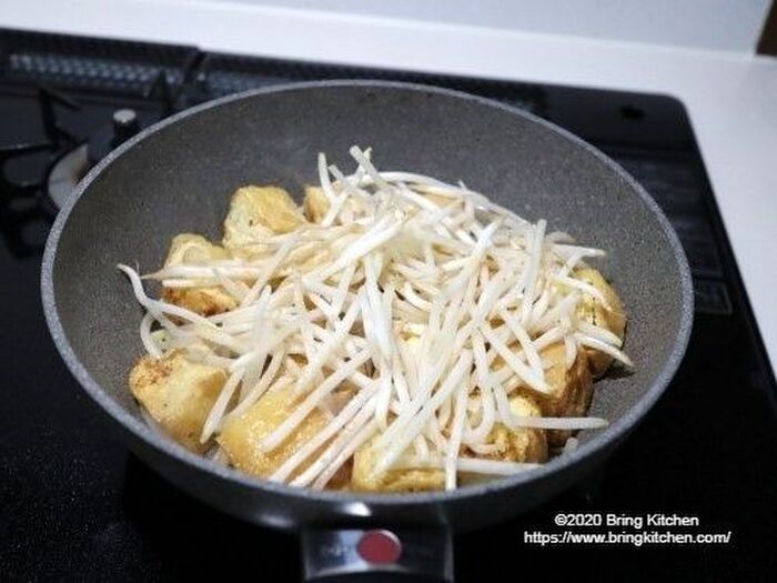 フライパンにごま油と生姜を入れて中火にかけ、フライパンが温まったら栃尾揚げを入れて焼く。