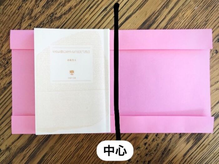⑴ まず横向きにおいた紙の中心に本を置いて上下の幅を決める。写真で示した部分に鉛筆で薄く線を引いておくと良い。