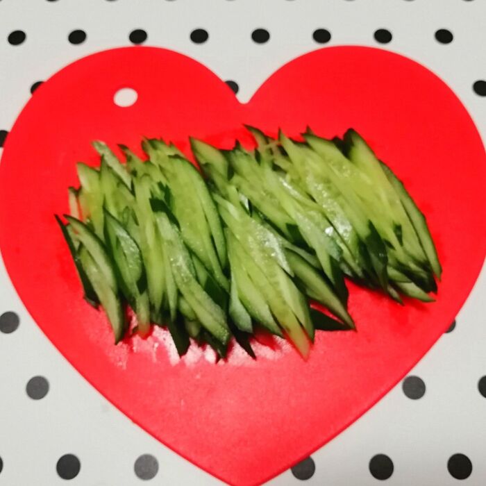 輪切りにしてから切ると、きゅうりが包丁に引っ付く↓バラバラ↓揃えるの面倒↓母から教わった切り方は簡単♡