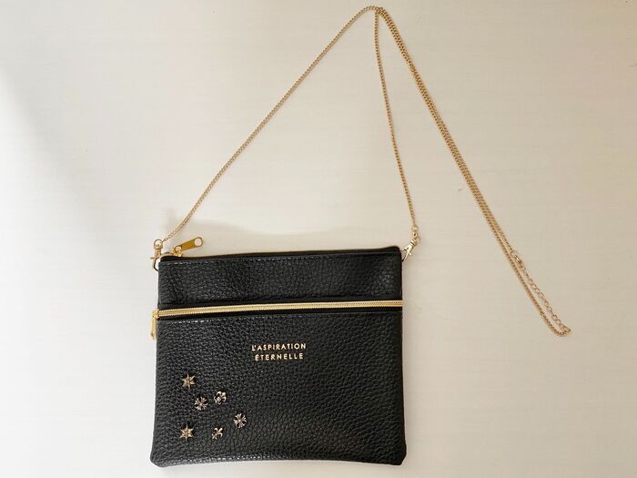 Wファスナーケース レザー調 14×17cm、アクセサリーチェーン 45cm 03 ネックレス喜平2.5mmが2本(すべてSeriaで購入しました)。