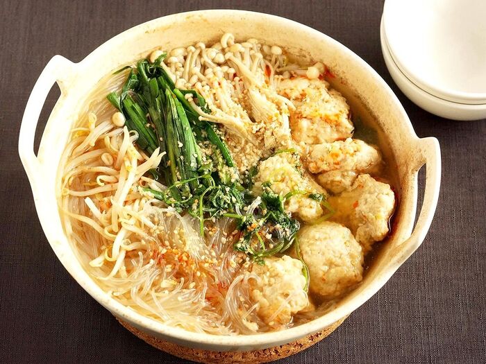 鍋に水と七彩べじぶろす、生姜をいれて、ナンプラーを入れる。ひと煮立ちしたら、1.の鶏ひき肉をスプーンですくって落とす。春雨、えのき、ニラ、もやし、香菜もいれて煮る。
