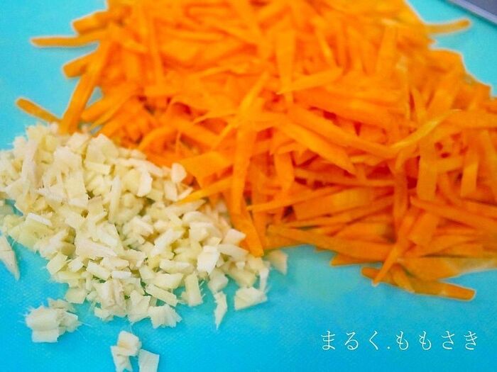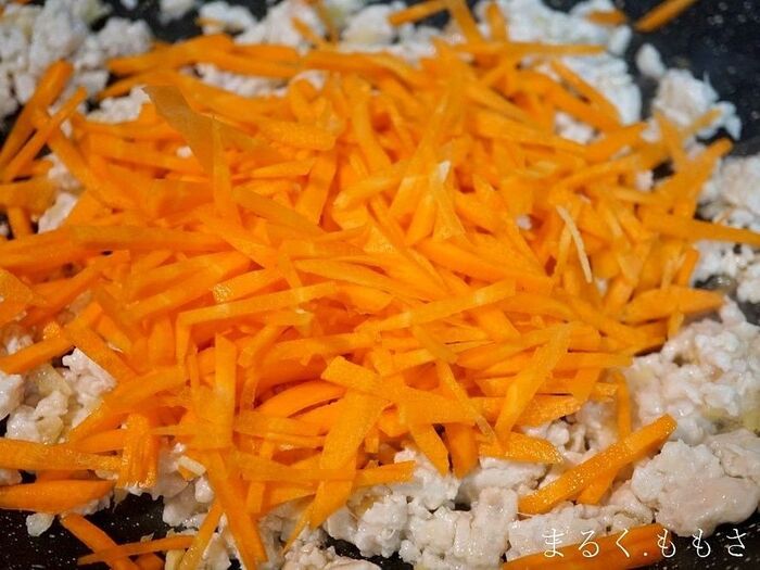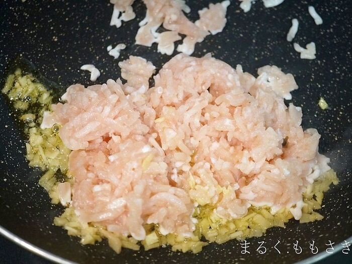 生姜を入れ香りが出たら鶏ひき肉を入れ、