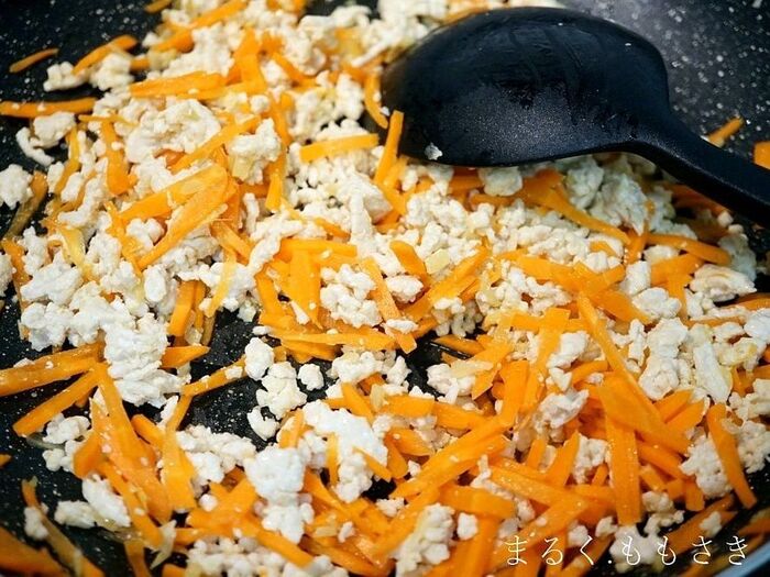 ※鶏ひき肉の塊を出来るならばヘラで潰しながら炒める。