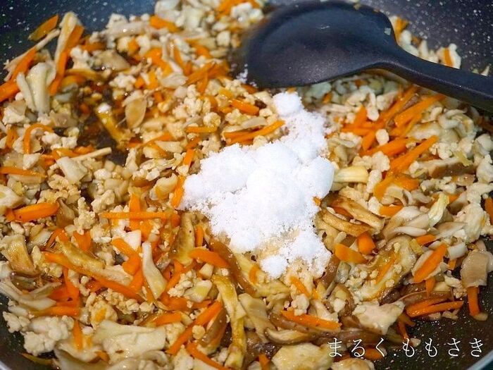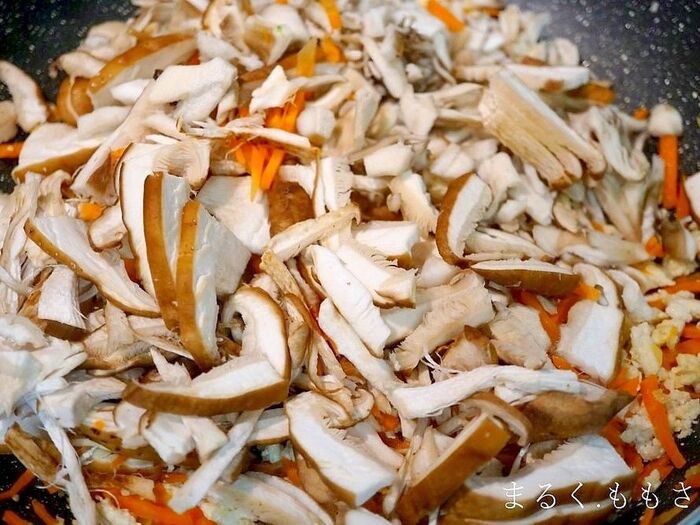 シイタケと舞茸を入れ塩を入れ2分程炒める。